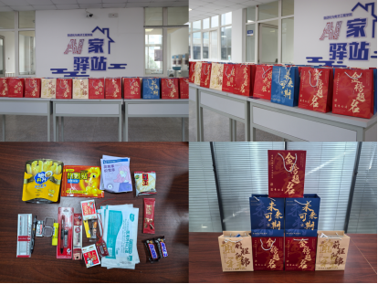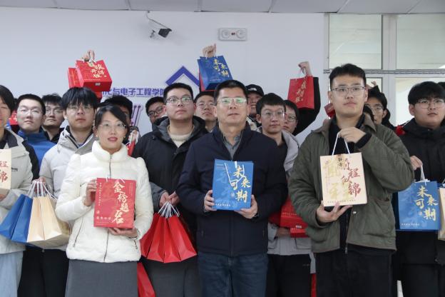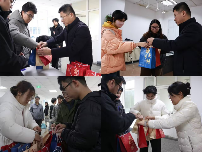 刘名森、张郁浩、全体辅导员亲手将装满关怀的考研大礼包送到每一位考研毕业生代表手中。礼包内精心准备了旺旺雪饼、薯片、士力架等能量零食,耳塞、眼罩、口罩、暖宝宝、面巾纸等实用生活用品,以及签字笔、格尺、小刀、涂卡笔等备考文具,更有承载美好祝愿的祈福香囊,每一份物品都饱含着学院对学子们的深切关怀与殷切期望。拿到大礼包的同学们脸上洋溢着喜悦的笑容,纷纷表示感受到了学院的温暖与支持,将把这份关怀转化为备考的动力,全力以赴冲刺考研。