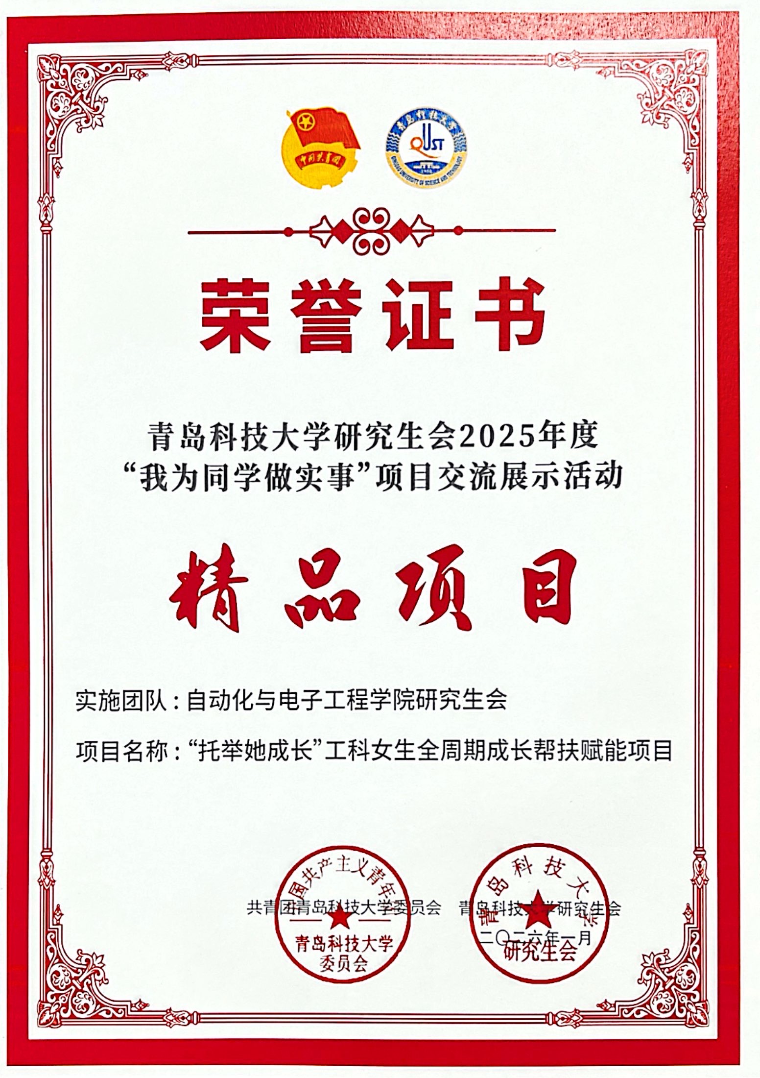 近日,青岛科技大学2025年度学生组织工作表彰结果揭晓,毛片学生会获评“2025年度先进学生会”,学院研究生会“托举她成长”工科女生全周期成长帮扶赋能项目入选年度“我为同学做实事”精品项目,以两项荣誉彰显学院学生工作的扎实成效与创新活力。